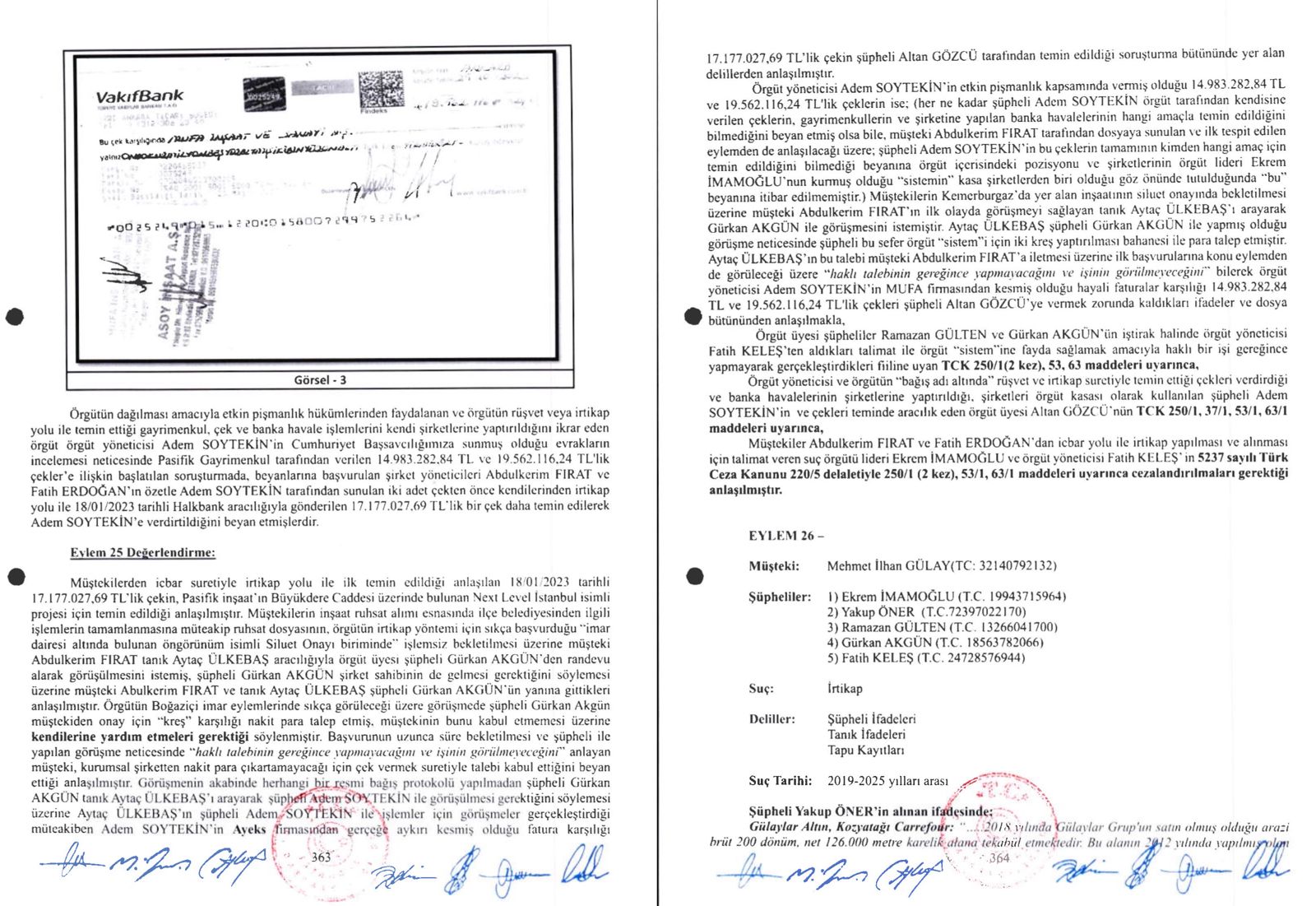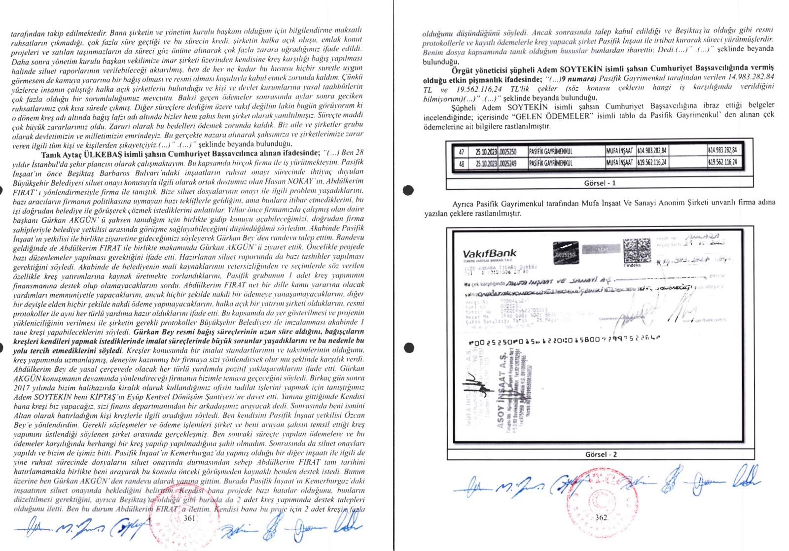 Soruşturmada etkin pişmanlıktan faydalanan Adem Soytekin, Pasifik Gayrimenkul’den aldığı 14 milyon 983 bin TL ve 19 milyon 562 bin TL tutarındaki iki çek ile 17 milyon 177 bin TL’lik banka havalesini doğruladı.