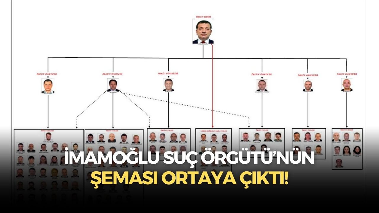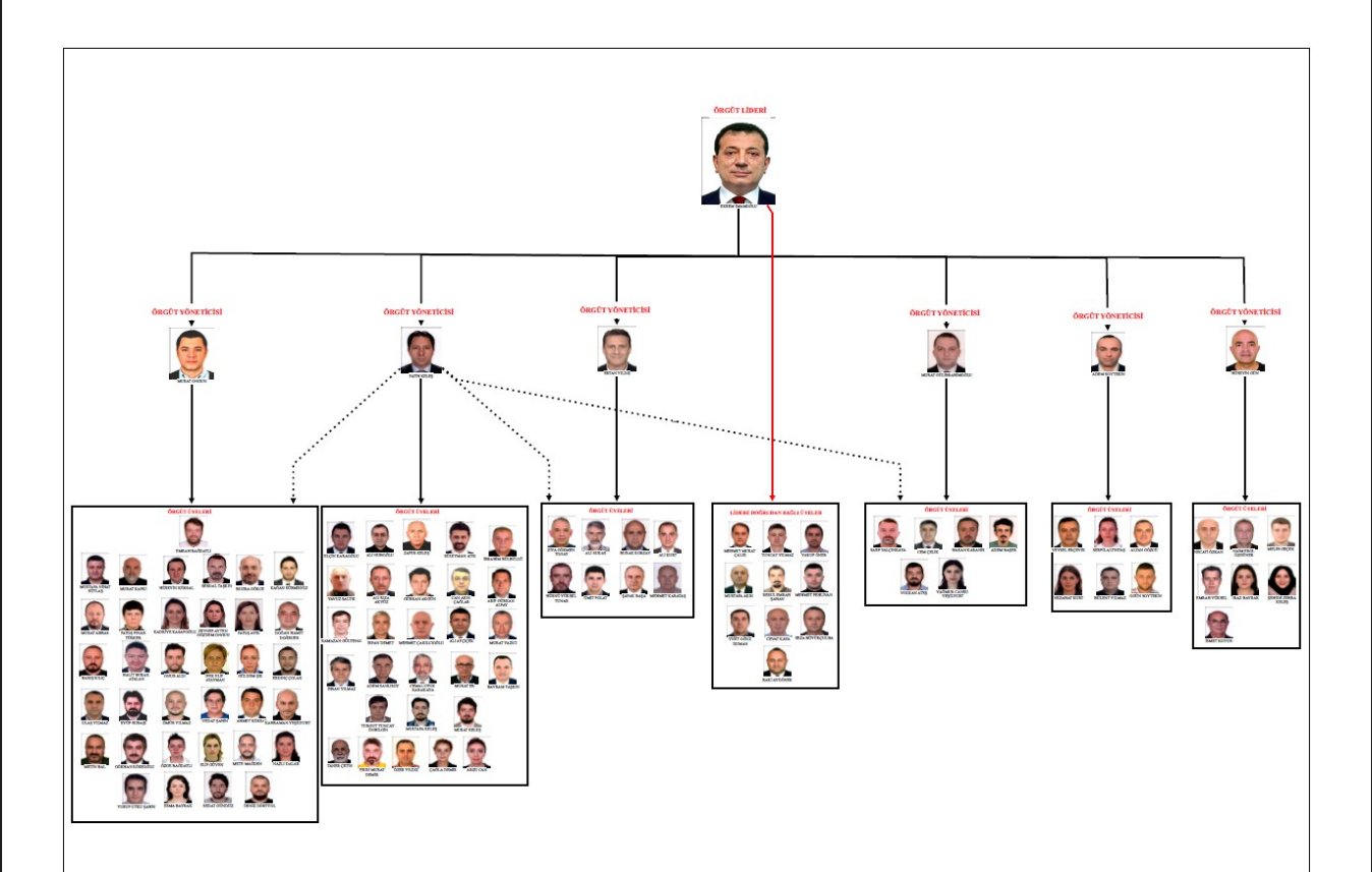 Hazırlanan iddianameye ekli görsel dosyada, Ekrem İmamoğlu’nun en üstte yer aldığı bir örgüt şeması da yer aldı. Şemada, aralarında Fatih Keleş, Murat Ongun, Ertan Yıldız, Murat Gülibrahimoğlu, Hüseyin Gün ve Adem Soytekin gibi isimlerin “örgüt yöneticisi” olarak tanımlandığı, bu kişilere bağlı olarak hareket eden çok sayıda belediye personeli ve iştirak yöneticisinin bulunduğu belirtildi.