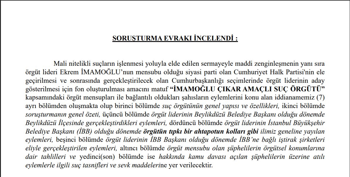 İddianamenin giriş bölümünde, İmamoğlu’nun Cumhuriyet Halk Partisi içinde etkinlik kazanmak, partiyi kontrol altına almak ve Cumhurbaşkanlığı adaylığını garanti altına almak amacıyla çıkar amaçlı bir yapılanma kurduğu iddia edildi.
