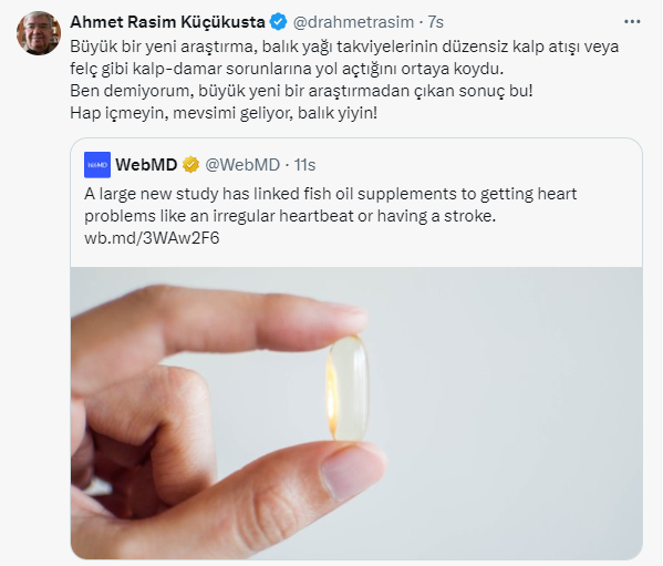 Üç tarafı denizlerle çevrili Türkiye'de balık tüketiminin yeterli seviyede olmaması 'balık yağı' takviyesi almaya zemin hazırlıyordu. Büyük bir sektör haline gelen takviyeler konusunda İngiltere'de yayınlanan bir araştırma yeni bir tartışma yaratacak gibi görünüyor. Göğüs hastalıkları uzmanı Prof. Dr. Ahmet Rasim Küçükusta 'büyük bir yeni araştırma, balık yağı takviyelerinin düzensiz kalp atışı veya felç gibi kalp-damar sorunlarına yol açtığını ortaya koydu' hatırlatmasında bulunarak 'ben demiyorum, büyük yeni bir araştırmadan çıkan sonuç bu! Hap içmeyin, mevsimi geliyor, balık yiyin!' çağrısında bulundu.