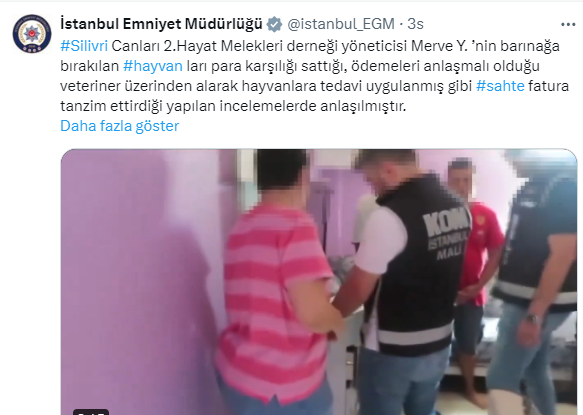 'Silivri Canları 2.Hayat Melekleri derneği yöneticisi Merve Y. ’nin barınağa bırakılan hayvan ları para karşılığı sattığı, ödemeleri anlaşmalı olduğu veteriner üzerinden alarak hayvanlara tedavi uygulanmış gibi sahte fatura tanzim ettirdiği yapılan incelemelerde anlaşılmıştır. Kısa süre önce barınağa teslim ettiği kendi hayvanını barınaktan geri almak isteyen bir vatandaştan ücret talep edildiği belirlenmiş, 230 Bin TL tutarında paranın şüpheli dernek yöneticisinin gönderdiği aracı şahsa teslim edilmesi üzerine, dernek görevlisi gerçekleştirilen operasyonla suçüstü yakalanmıştır.'