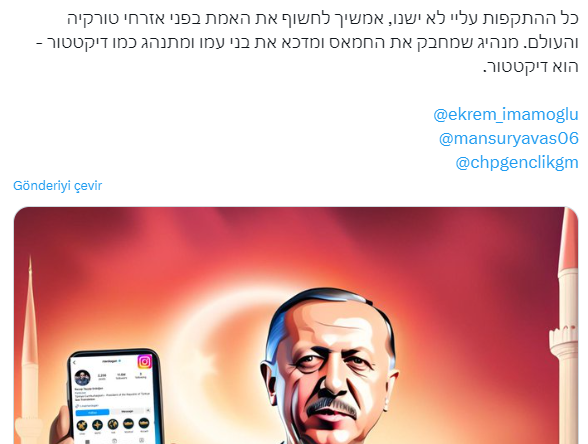 Bana yönelik tüm saldırılar değişmeyecek, Türkiye ve dünya vatandaşlarına gerçekleri ortaya çıkarmaya devam edeceğim. Hamas'ı kucaklayan, halkına zulmeden, diktatör gibi davranan lider diktatördür' ifadelerine yer verdi. Geçtiğimiz günlerde attığı mesaja Ekrem İmamoğlu'nu etiketleyen Katz'ın bu kez bir adım ileriye giderek hem İmamoğlu'nu, hem Mansur Yavaş'ı hem de CHP Gençlik Kolları'nı etiketlediği görüldü.