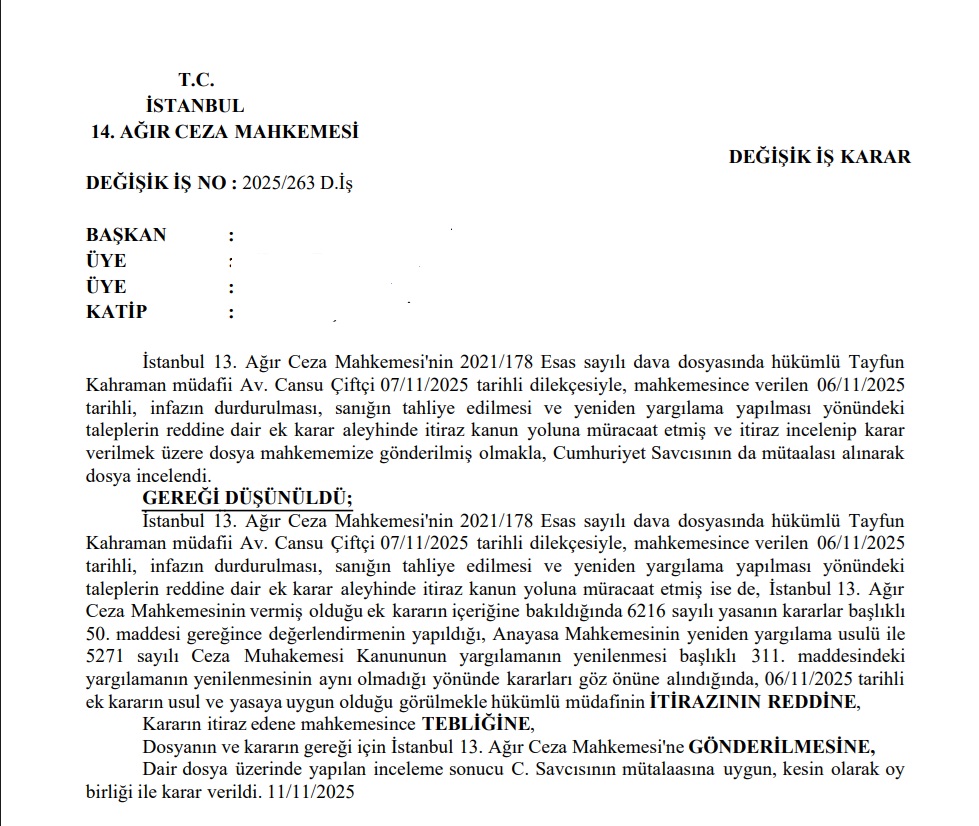 14. Ağır Ceza Mahkemesi ise 11.11.2025 tarihli kararıyla itirazı kesin olarak reddetti. Kararda, 13. Ağır Ceza Mahkemesi’nin kararının “yasa ve usule uygun” olduğu belirtildi.