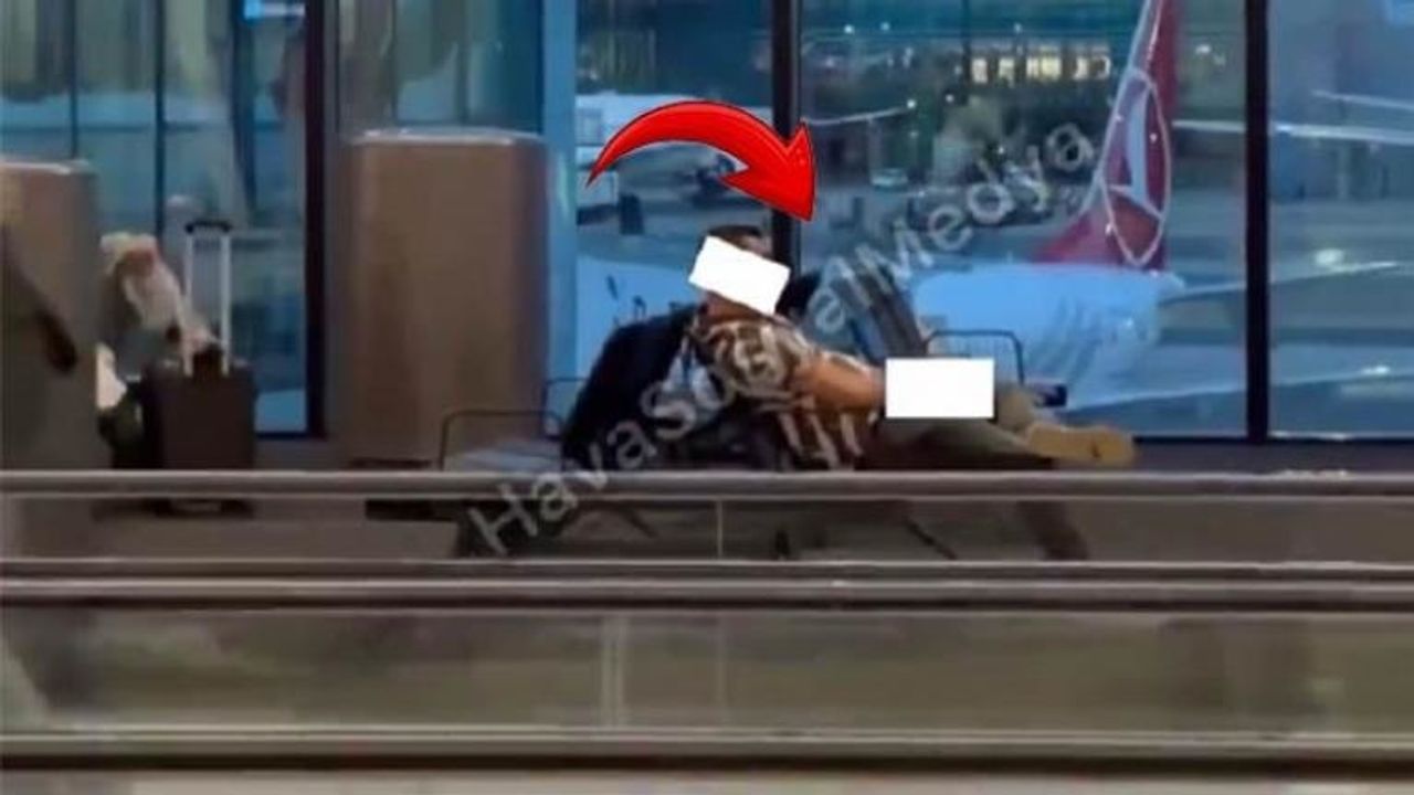 Dünyanın en iyi 10 havalimanı arasında yer alan ve her gün binlerce yolcunun kullandığı İstanbul Havalimanı'nda kayda geçen görüntüler bu kadarına da 'pes' dedirtti. Dış hatlar terminalinde uçak seferlerinin beklendiği banklarda oturan yolculardan biri, çevresindeki onlarca kişiye aldırış etmeden kendini tatmin etmeye başladı.