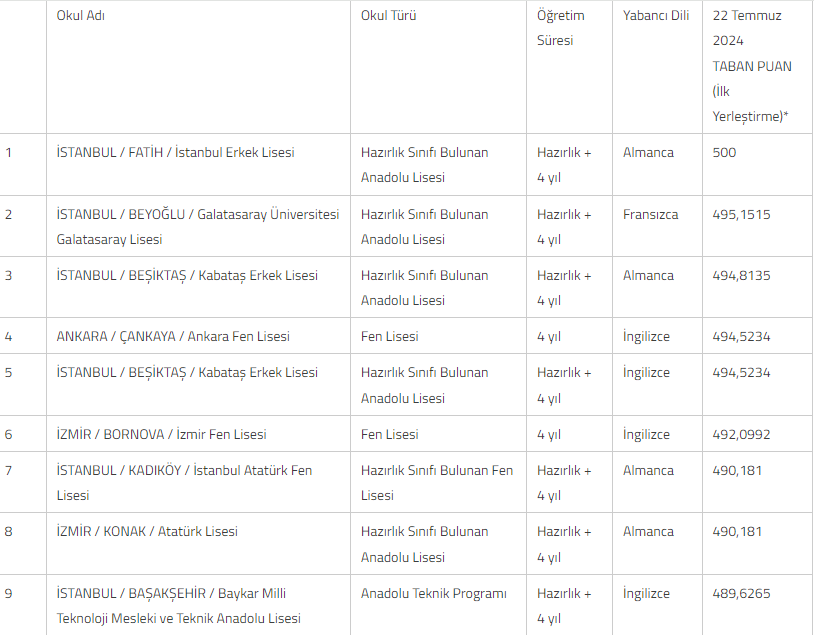 LGS 2024 yerleştirme sonuçlarının ardından Türkiye'nin en yüksek puanla öğrenci alan liseleri belli oldu. Bu yıl Almanca eğitim veren okulların yükselişi dikkat çekerken Almanya'daki üniversitelerin ve çalışma olanaklarının tercihlerde etkili olduğu görülüyor. Anadolu liselerinin doluluk oranı yüzde 99.66, İmam Hatip Liselerinin doluluk oranı yüzde 95, meslek liselerinin doluluk oranı yüzde 93.26 olarak gerçekleştiği bildirildi.