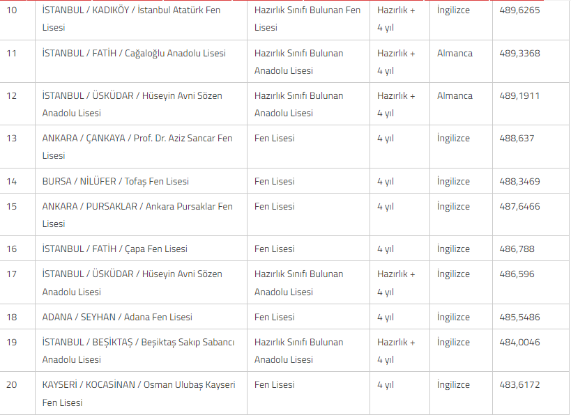 Türkiye geneli en yüksek puanla öğrenci alan ilk 100 lisenin zirvesinde 500 tam puanla öğrenci alan İstanbul Erkek Lisesi Almanca bölümü yer alıyor. Onu Galatasaray Lisesi ve Kabataş Erkek Lisesi Almanca bölümü izliyor.