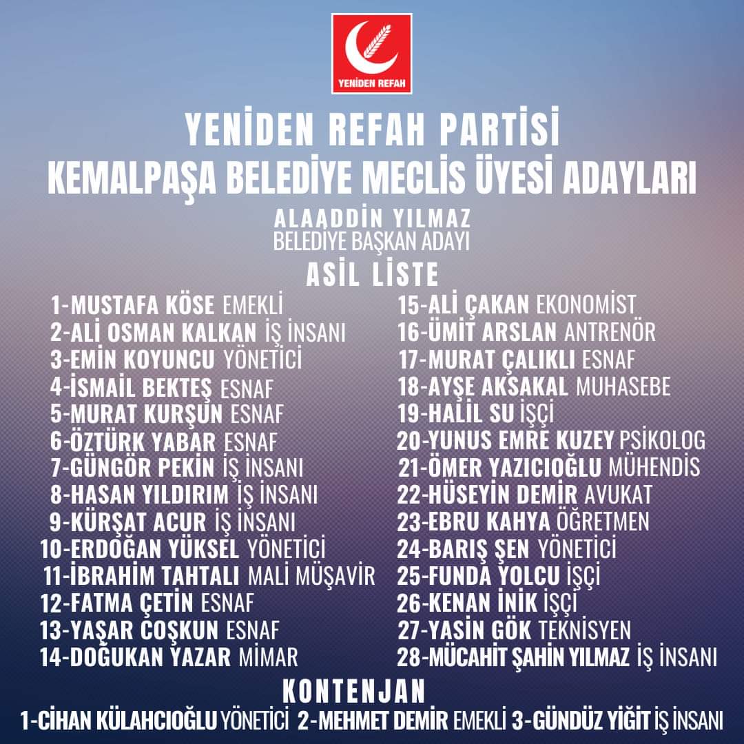İşte Alaaddin Yılmaz'ın Belediye Başkanı olarak yarışa katılacağı Yeniden Refah Partisi'nin Kemalpaşa Meclis Üyeliği Aday listesi.