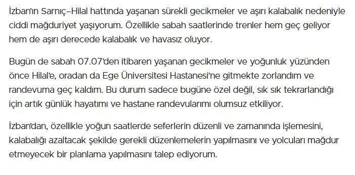 Burak isimli bir yolcu, özellikle Sarnıç–Hilal hattında sürekli gecikmeler ve aşırı kalabalık yaşandığını belirterek sabah saatlerinde trenlerin geç geldiğini ve havasız olduğunu kaydetti. 07.07 itibarıyla başlayan gecikmeler nedeniyle önce Hilal’e, ardından Ege Üniversitesi Hastanesi’ne ulaşmakta zorlandığını ve randevusuna geç kaldığını ifade eden yolcu, sorunun sık tekrarlandığını ve günlük hayatını olumsuz etkilediğini belirtti.