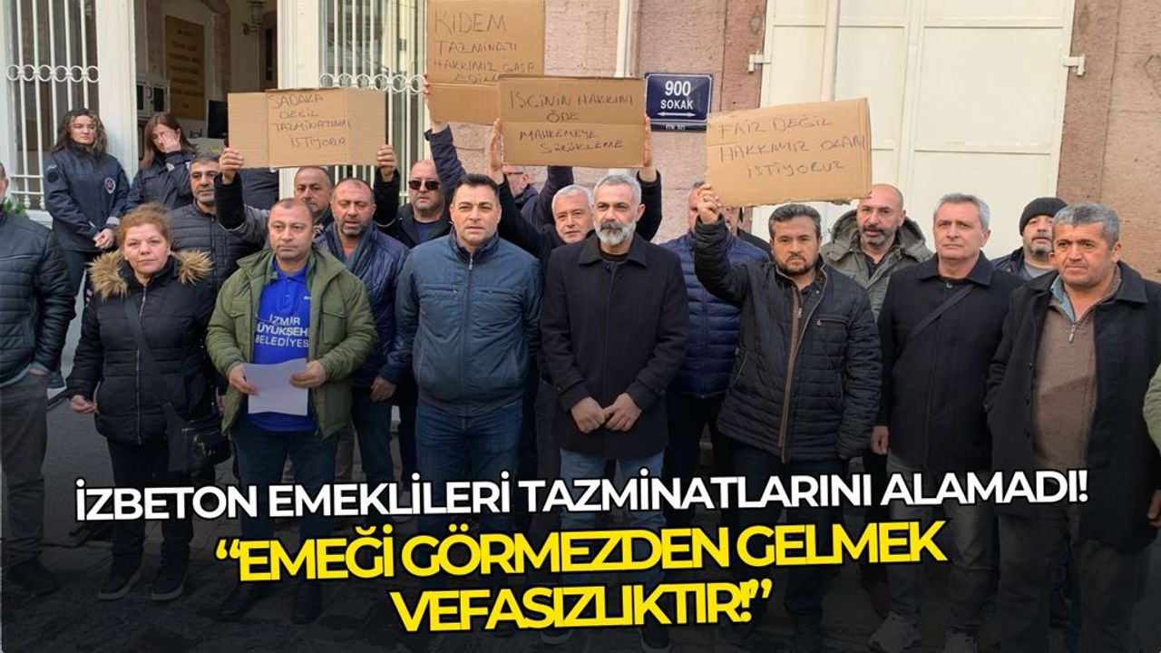 Son Mühür / Arif Enes Durak - İzmir Büyükşehir Belediyesi’ne bağlı İZBETON şirketinden emekli olmalarına rağmen 3 aydır yasal tazminatlarını alamayan işçiler, Egemenlik Binası önünde basın açıklaması gerçekleştirdi. Yaklaşık 145 işçinin belediye yetkilileri ile yaptıkları görüşmelerden sonuç alamadıkları ve 3 aydır hak ettikleri yasal tazminatların hesaplarına yatırılmamasını bekledikleri öğrenildi.