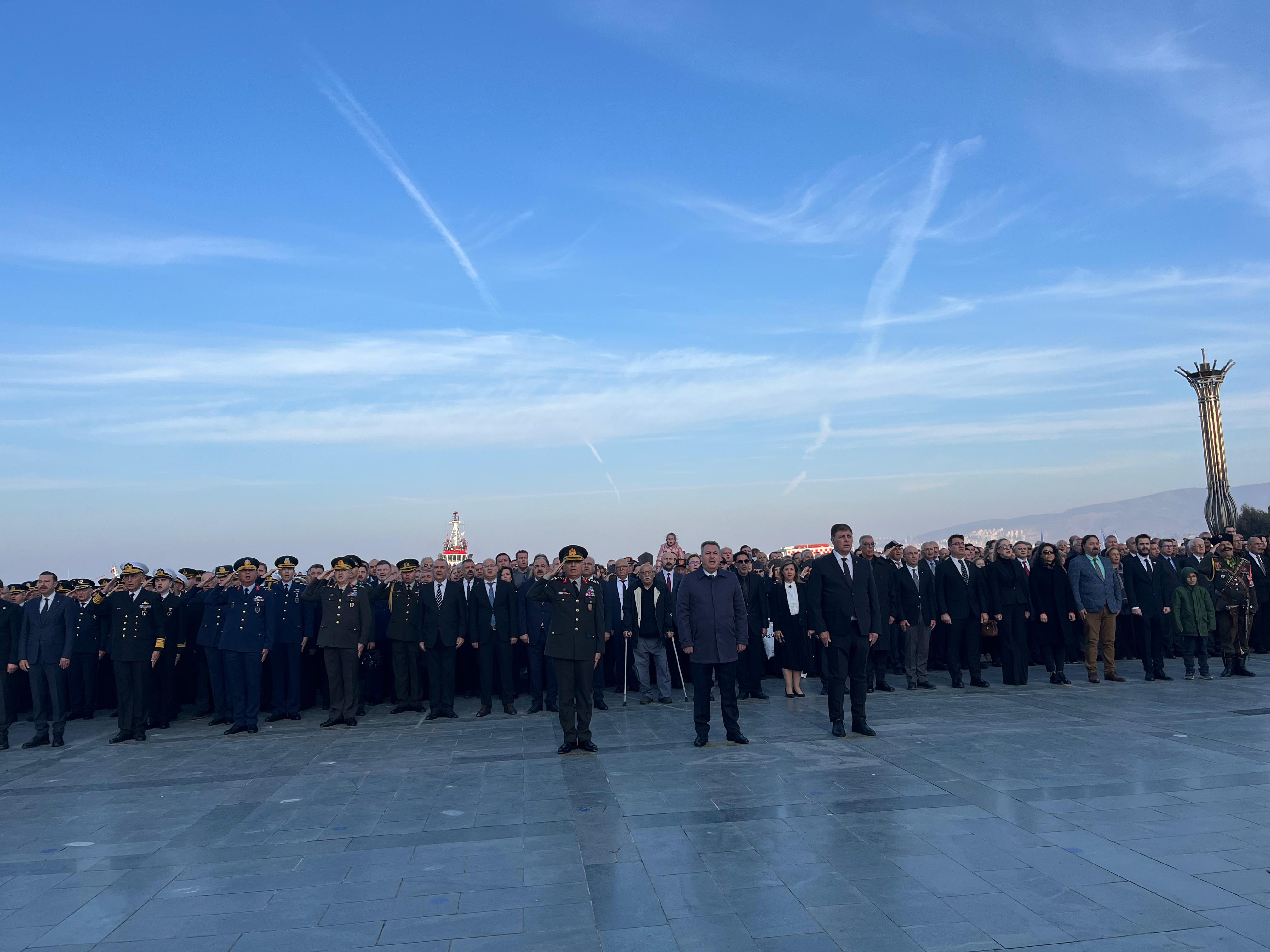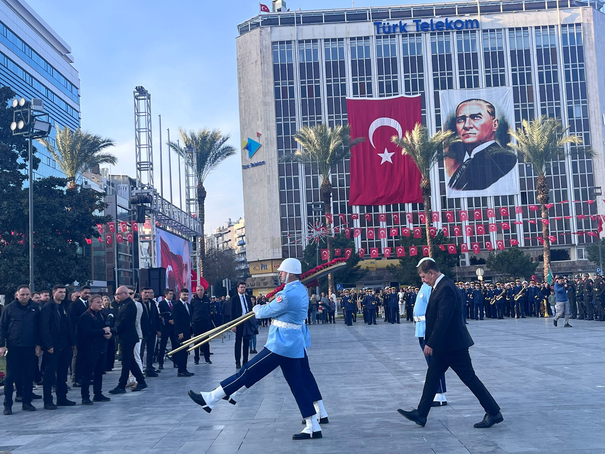 GAMZE ESKİKÖY- İzmir, 10 Kasım sabahı saat 08:50’de Cumhuriyet Meydanı’nda çelenk bırakma töreniyle Gazi Mustafa Kemal Atatürk’ü anmak için tek yürek oldu. Gerçekleştirilen törene İzmir Valisi Süleyman Elban, Ege Garnizon Komutanı Orgeneral İrfan Özsert, İzmir Büyükşehir Belediye Başkanı Cemil Tugay olmak üzere tüm protokol eksiksiz katıldı. İzmir Valiliği, Ege Ordusu ve Garnizon Komutanlığı ile İzmir Büyükşehir Belediye Başkanlığı tarafından gerçekleştirilen törende, Atatürk’ün aziz hatırasına çelenkler sunuldu.