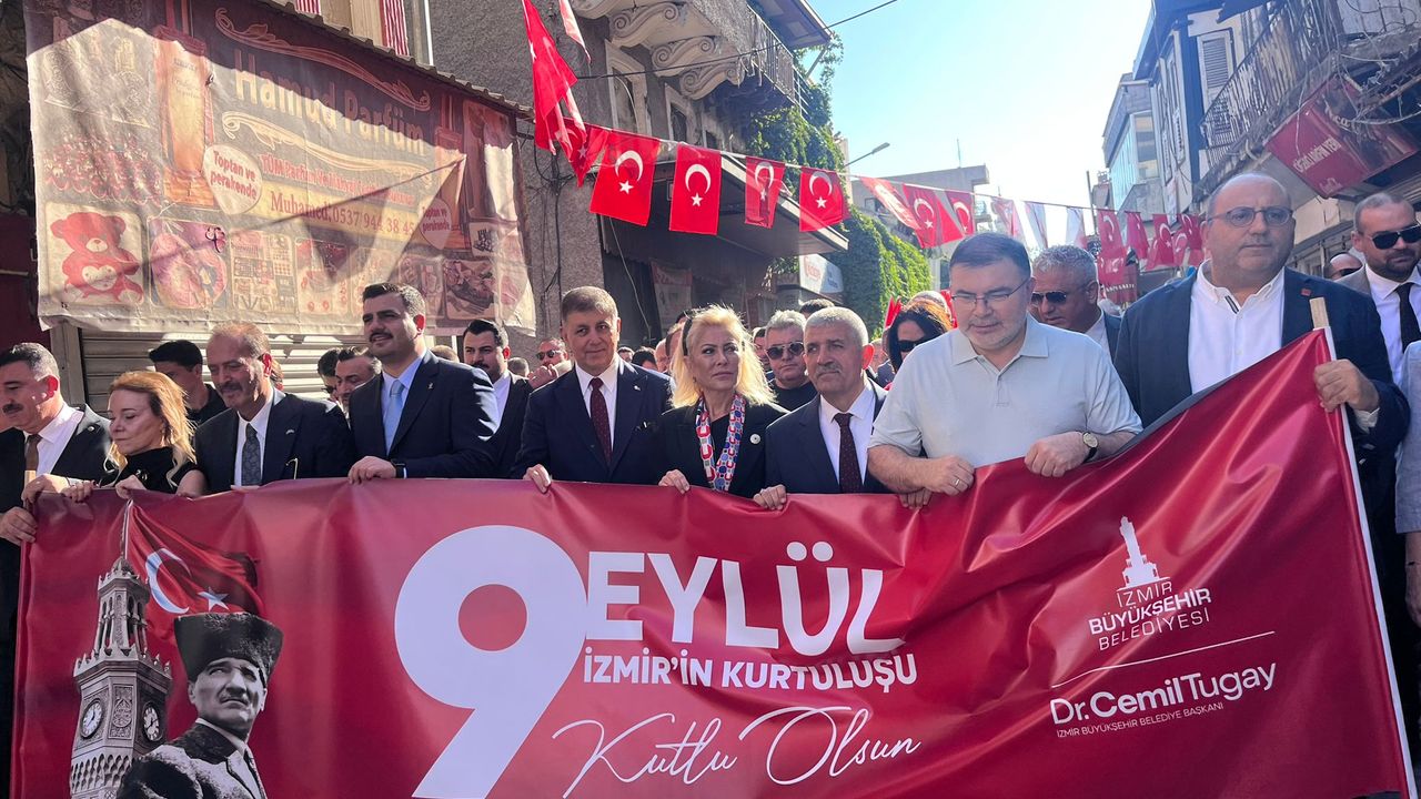 Son Mühür/Gamze Eskiköy- İzmir’in 9 Eylül kutlama programı, Basmane Karakolu önünden başlayan yürüyüşle start aldı. Binlerce İzmirli, İzmir Büyükşehir Belediye Başkanı Cemil Tugay, ilçe belediye başkanları ve sivil toplum kuruluşu temsilcileriyle birlikte Cumhuriyet Meydanı’na yürüdü.