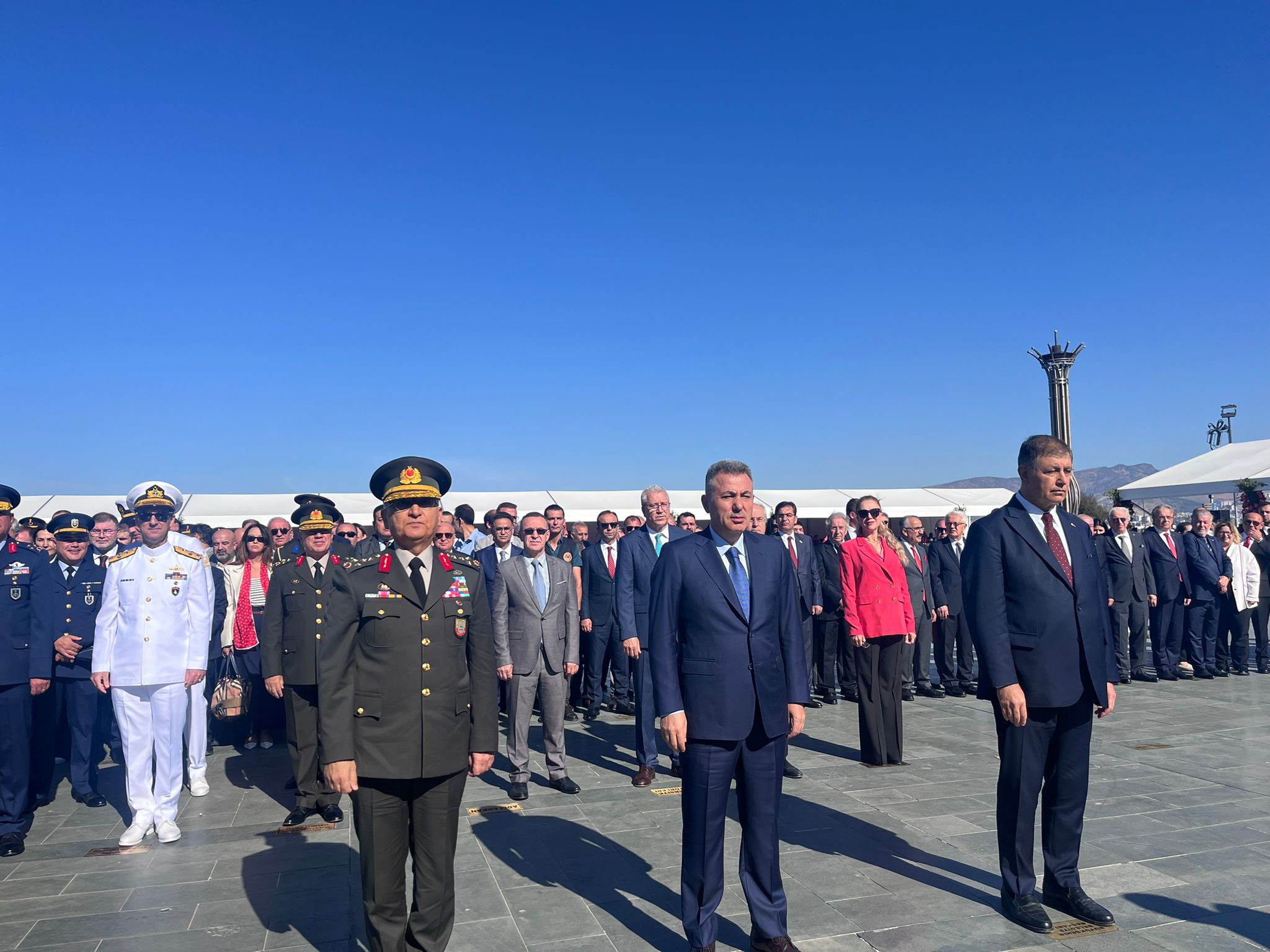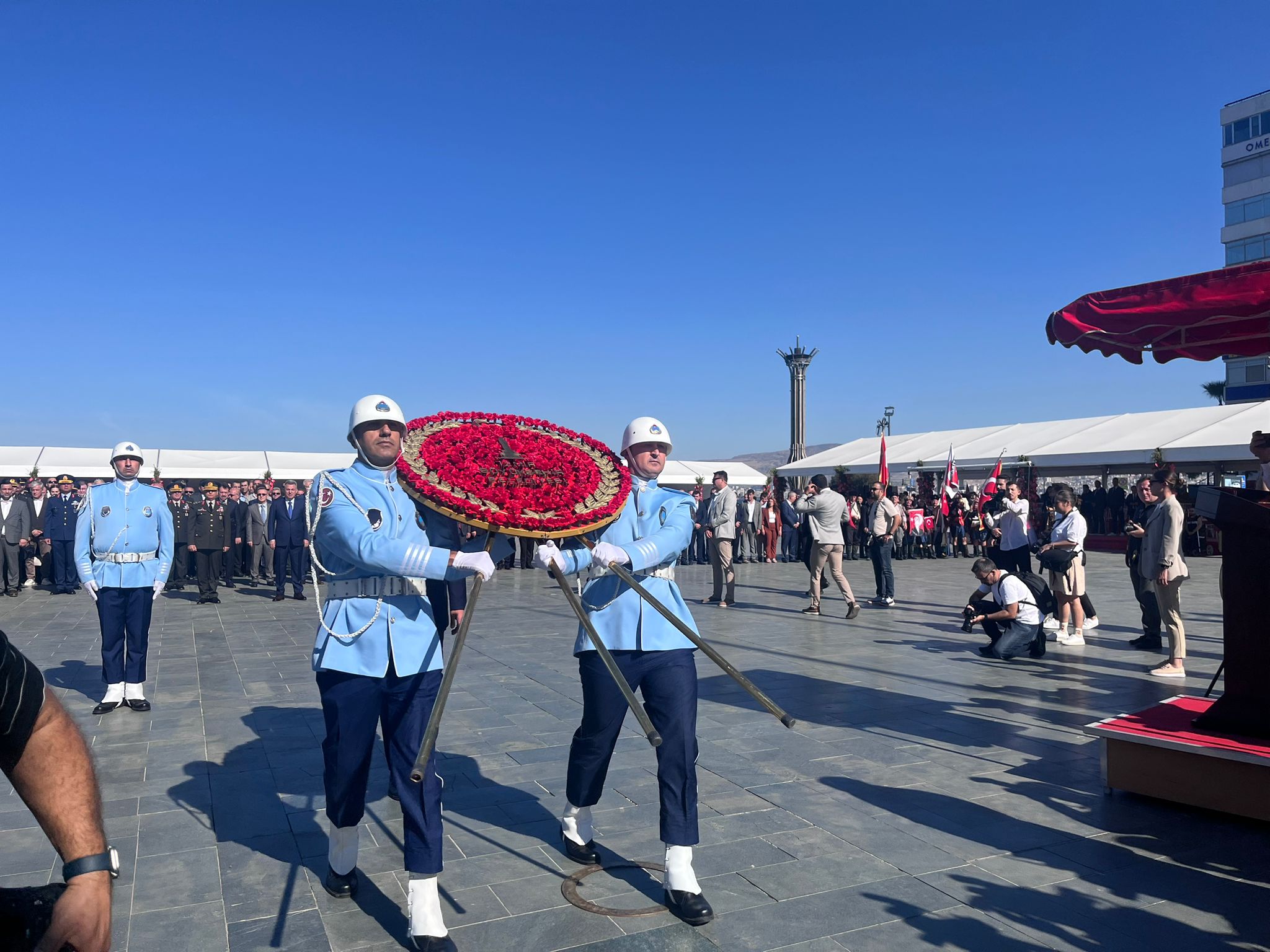 Cumhuriyet Meydanı’ndaki törende İzmir Valisi Süleyman Elban, İzmir Büyükşehir Belediye Başkanı Cemil Tugay ve Ege Garnizon Komutanlığı yetkilileri hazır bulundu. Program, 1 dakikalık saygı duruşu ve İstiklal Marşı’nın okunmasıyla devam etti.