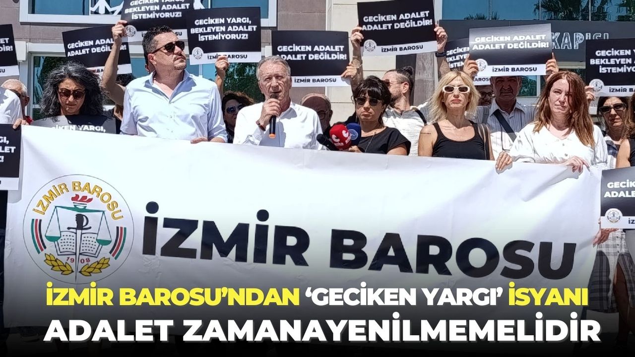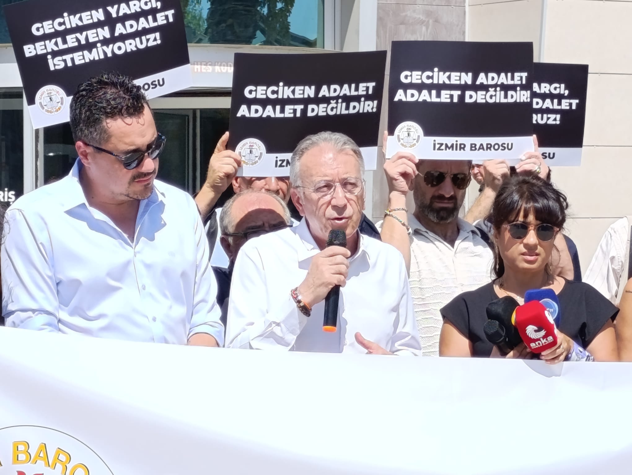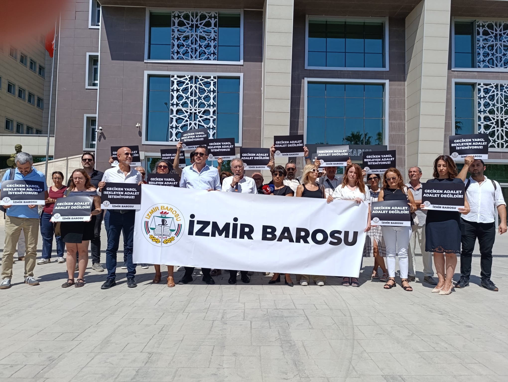 Avukatların “Geciken adalet adalet değildir” dövizleriyle katıldığı basın açıklamasını İzmir Barosu Başkanı Sefa Yılmaz okudu.