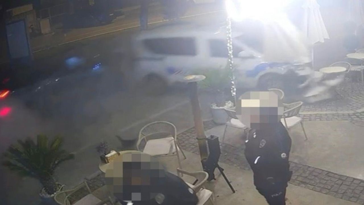 Polis aracı kafeteryanın dış bölümüne savruldu