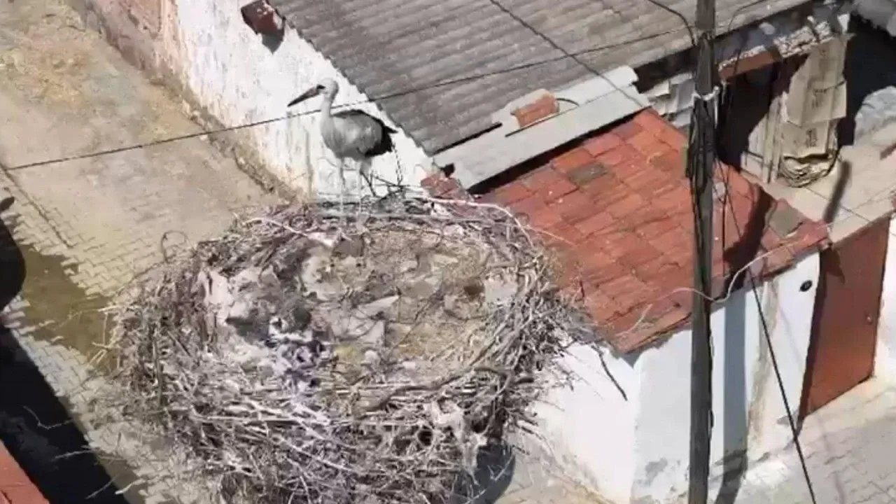 Çiğli ilçesi Harmandalı Mahallesi'nde elektrik direği üzerindeki yuvasında çırpınan bir yavru leylek, çevredeki vatandaşların dikkatini çekti.