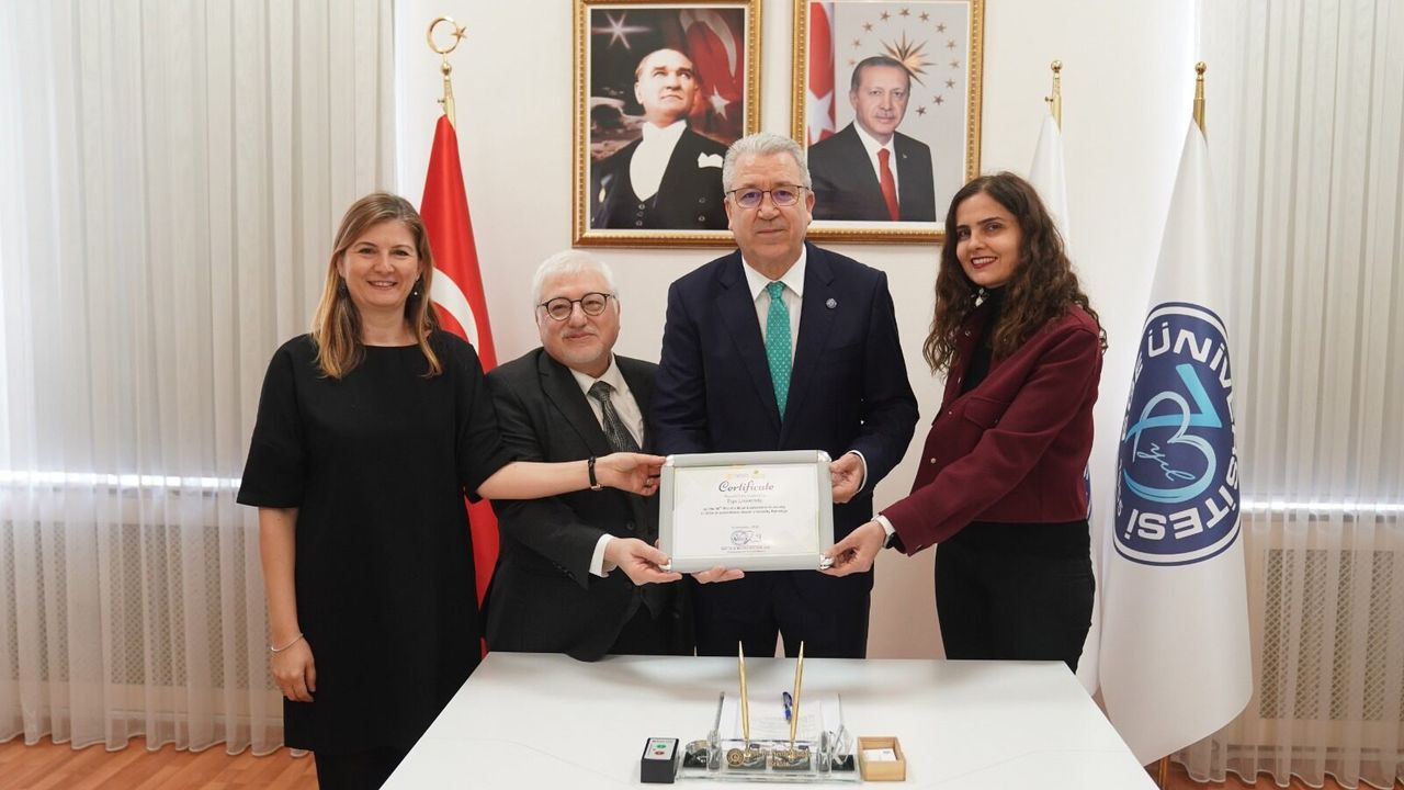 SON MÜHÜR - MERVE TURAN/ Ege Üniversitesi Çevre Uygulama ve Araştırma Merkezi (EÜ ÇEVMER) Müdürü Prof. Dr. Armağan Kınal, Müdür Yardımcıları Doç. Dr. İnci Tüney Kızılkaya ile Doç. Dr. Esra Akat, Ege Üniversitesi Rektörü Prof. Dr. Necdet Budak’ı makamında ziyaret ederek Greenmetric tarafından hazırlanan sertifikayı takdim etti.