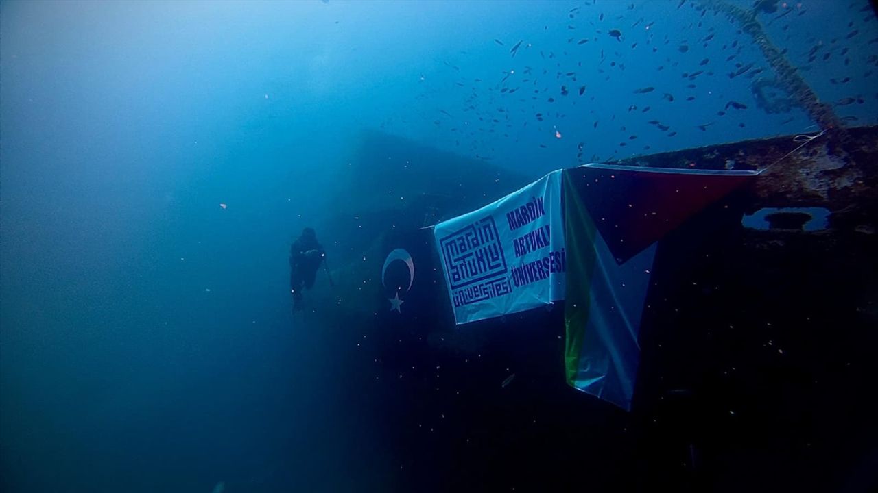 Mardin Artuklu Üniversitesi personeli ile dalış eğitmeni Cenk Yılmaz ve ekibi, İzmir’in Karaburun ilçesi açıklarında bulunan “9 Eylül” vapuru batığında, Türk ve Filistin bayrakları açarak Gazze’de yaşanan insani krize dikkat çekti.