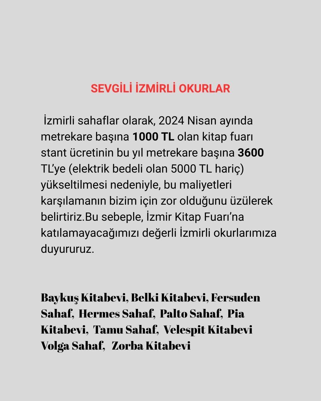 Baykuş Kitapevi, Belki Kitapevi, Fersuden Sahaf, Palto Sahaf, Pia Kitabevi, Tamu Sahaf, Velespit Kitabevi, Volga Sahaf, Zorba Kitapevi tarafından yapılan açıklamada, maliyetlerin karşılanamanın zorluğuna dikkat çekildi. Açıklamada, "İzmirli safahlar olarak, 2024 Nisan ayında mertekare başına 1000 TL olan kitap fuarı stant ücretleri, 2025 yılı için metrekare başına 3 bin 600 TL'ye (elektrik bedeli olan 5 bin TL hariç) yükselmesi nedeniyle, bu maliyetleri karşılamanın bizim için zor olduğunu üzülerek belirtiriz. Bu sebeple, İzmir Kitap Fuarı'na katılamayacağımızı değerli İzmirli okurlarımıza dururuz" ifadeleri kullanıldı.