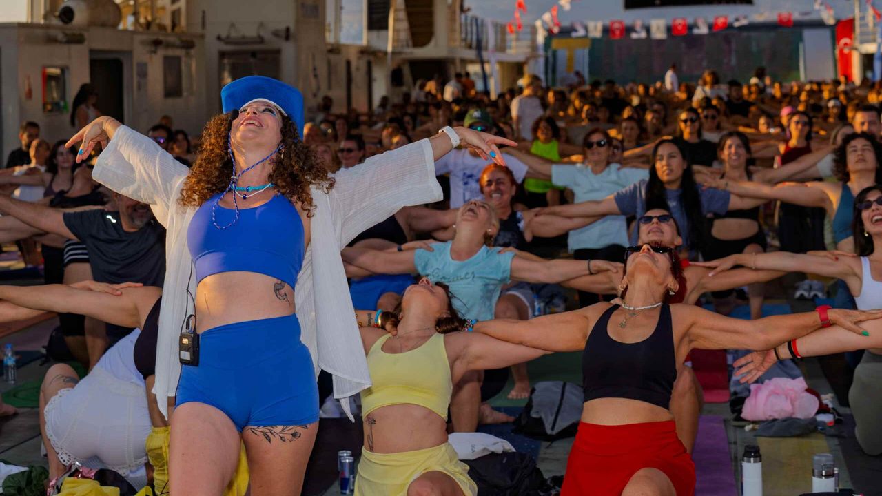 Bostanlı Vapur İskelesi’nden hareket eden vapurda yaklaşık 400 katılımcı, yoga eğitmeni Beste Elvanlı eşliğinde denizin ortasında yoga yaptı. Katılımcılar, yılın en uzun gününü gün batımı eşliğinde, doğayla iç içe geçirdikleri bir etkinlikle uğurladı.