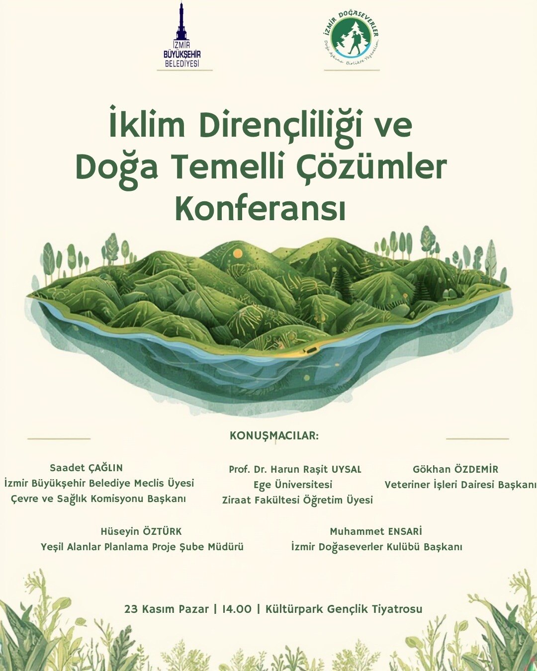 Konferansta, şehirlerin iklim değişimine uyum sağlaması ve doğanın sunduğu sürdürülebilir çözümler konusunda deneyim ve bilgiler paylaşılacak. Etkinlikte konuşma yapacak isimler arasında Saadet Çağlın (İzmir Büyükşehir Belediye Meclis Üyesi, Çevre ve Sağlık Komisyonu Başkanı), Prof. Dr. Harun Raşit Uysal (Ege Üniversitesi Ziraat Fakültesi), Gökhan Özdemir (Veteriner İşleri Dairesi Başkanı), Hüseyin Öztürk (Yeşil Alanlar Planlama Proje Şube Müdürü) ve Muhammet Ensari (İzmir Doğaseverler Kulübü Başkanı) yer alıyor.