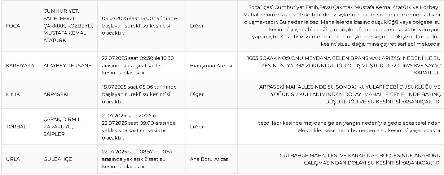 Son Mühür- İzmir’in çeşitli ilçelerinde farklı nedenlerle su kesintileri yapılacak. Planlı altyapı çalışmaları, arızalar ve yüksek su tüketimine bağlı olarak gerçekleşecek kesintiler, bazı bölgelerde uzun sürebilecek.