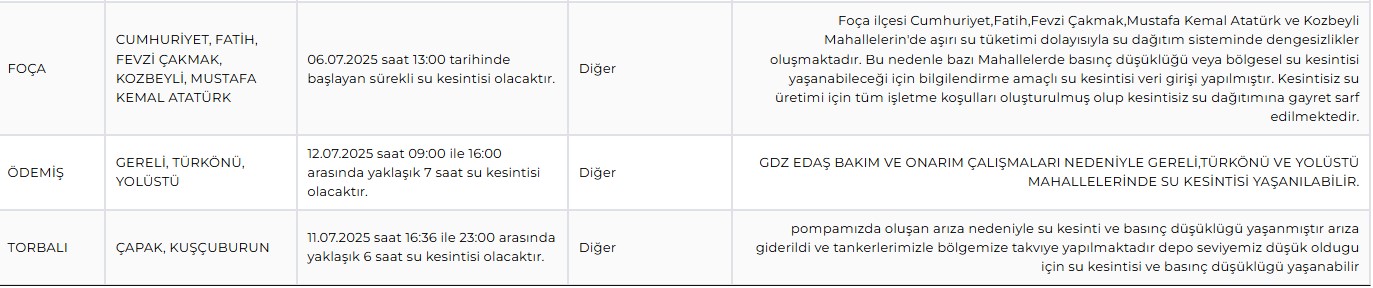 Foça ilçesinin Cumhuriyet, Fatih, Fevzi Çakmak, Mustafa Kemal Atatürk ve Kozbeyli mahallelerinde 6 Temmuz 2025 saat 13.00 itibarıyla başlayan su kesintisi sürüyor. Yoğun su kullanımı nedeniyle şebeke sisteminde dengesizlik oluştuğu ve bu nedenle kesintisiz su temini sağlanamadığı bildirildi.