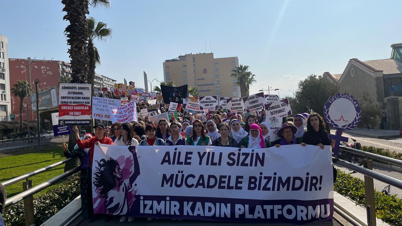 İzmir Kadın Platformu tarafından yapılan açıklamada, "8 Mart’ta İzmirli kadınlar olarak bu tarihten aldığımız güçle, yoksulluğa, güvencesiz çalışmaya, şiddete karşı eşit, özgür, insanca bir yaşam için alanlardayız. AKP iktidarı, 2024 yılında açıklanan orta vadeli program ve 12. kalkınma planında yer alan esnek ve güvencesiz çalışmayı yaygınlaştırma planlarının bir parçası, gerici iktidarının tahkimi için 2025 yılını “Aile yılı” ilan etti. Plana göre aile ile iş yaşamının uyumlulaştırılması adı altında kadınlara esnek, güvencesiz, düşük ücretlerle çalışma dayatılırken, “ailenin güçlendirilmesi” vurgusuyla cinsiyet eşitsizliğini derinleştirecek politikalar bir bir hayata geçirilerek kadınlar aileye, aile içinde de erkeğe daha bağımlı hale getirilmek isteniyor. Sermayenin ucuz emek ihtiyacı için boşanma oranlarının artması, doğum oranlarının düşmesi bahane edilerek Nüfus Politikaları ve Aile Enstitüsü kuruluyor. Evlilikler daha çok borçlandırarak teşvik ediliyor, boşanmalara arabulucu uygulamaları tekrar tekrar gündeme getiriliyor, nafaka hakkı yeniden tartışmaya açılıyor. Genel ahlak’ kavramıyla ortaya attıkları yasa tasarıları ile Türk Ceza Kanunu’nda yapılmak istenen değişikliklerle toplumsal yaşamı dini referanslarla inşa etmeye; kadınların ve LGBTİ+’ların yaşamlarını biyolojik cinsiyete sıkıştırmaya, kadınların eşitlik ve özgürlük mücadelesini engellemeye, kamusal alandaki var oluşumuzu kısıtlamaya çalışıyorlar" ifadeleri kullanıldı.