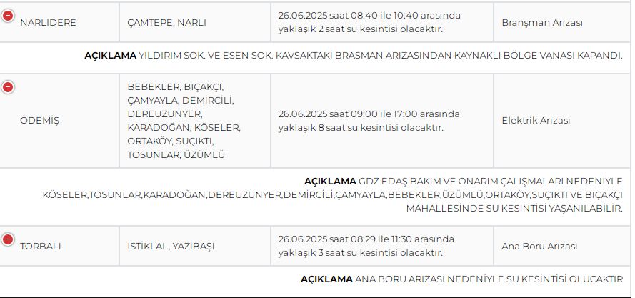 Son Mühür- İzmir Su ve Kanalizasyon İdaresi Genel Müdürlüğü (İZSU), 26 Haziran 2025 Perşembe günü kent genelinde bazı ilçelerde su kesintisi yaşanacağını duyurdu. Arıza ve bakım çalışmaları nedeniyle planlanan kesintilerden Narlıdere, Ödemiş, Torbalı ve Foça ilçeleri etkilenecek.