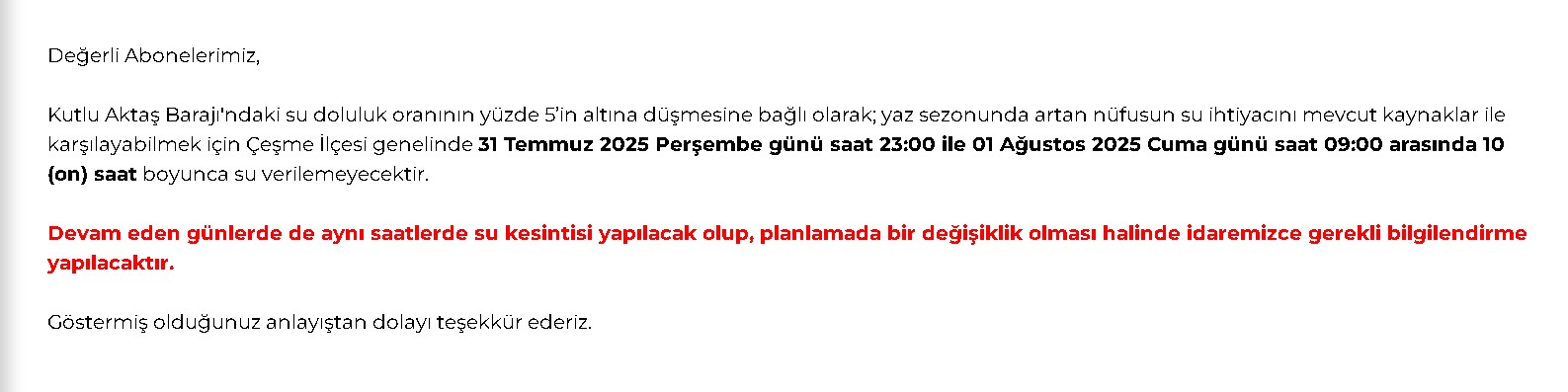 Çeşme’de ise Kutlu Aktaş Barajı’ndaki doluluk oranının yüzde 5’in altına düşmesi ve yaz sezonunda artan nüfusun su ihtiyacı nedeniyle, ilçe genelinde planlı su kesintisi uygulanacak. İlk kesinti, 31 Temmuz 2025 Perşembe saat 23.00’te başlayacak ve 1 Ağustos 2025 Cuma saat 09.00’da sona erecek. Kesintilerin aynı saatlerde takip eden günlerde de devam edeceği açıklandı.