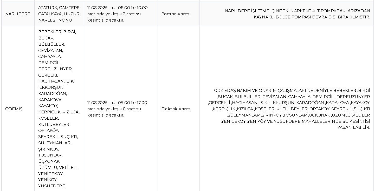 Ödemiş’te Bebekler, Birgi, Bucak, Bülbüller, Cevizalan, Çamyayla, Demircili, Dereuzunyeri, Gerçekli, Hacıhasan, Işık, İlk Kurşun, Karadoğan, Karakova, Kayaköy, Kerpiçlik, Kızılca, Köseler, Kutlubeyler, Ortaköy, Seyrekli, Suçıktı, Süleymanlar, Şirinköy, Tosunlar, Üçkonak, Üzümlü, Veliler, Yeniceköy, Yeniköy ve Yusufdere mahallelerinde 11 Ağustos 2025 günü saat 09.00 ile 17.00 arasında yaklaşık 8 saat su kesintisi olacak. GDZ Elektrik’in bakım ve onarım çalışmaları nedeniyle yaşanacak elektrik kesintisinin, su iletimini de durduracağı belirtildi.
