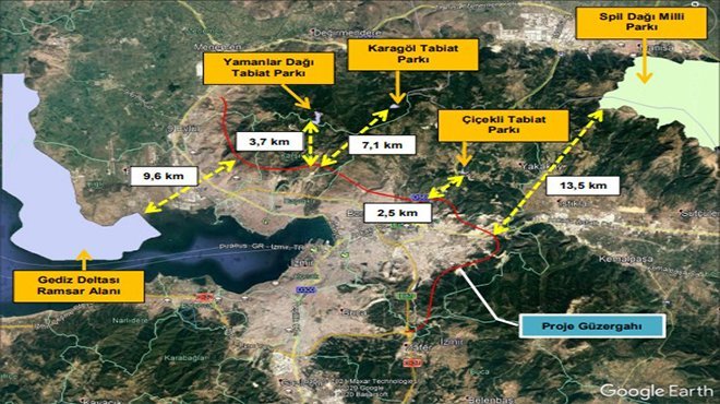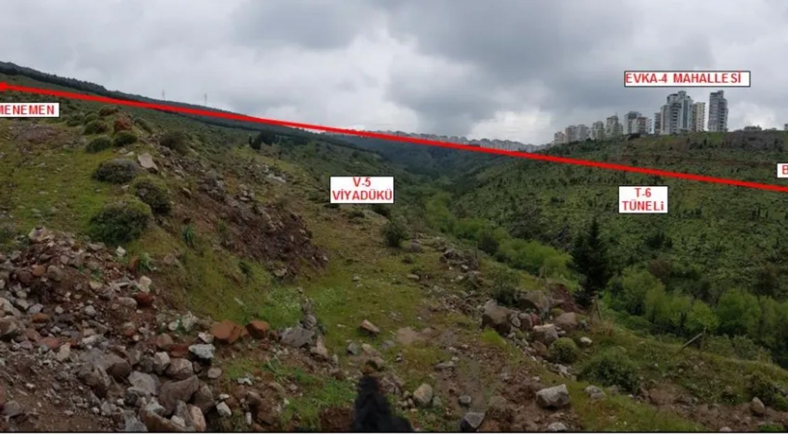 “Proje güzergahı Menemen-Çandarlı Otoyolu'nun Koyundere kesiminden ayrılmakta, Menemen ve Çiğli'nin doğusundaki dağlık kesimden güney istikametinde geçerek doğuya yönelmektedir. Bu kesimde de Bayraklı ve Karşıyaka'nın kuzeyinden doğu istikametinde geçen proje hattı, geçmiş yıllarda projesi tamamlanan Bornova Çevre Yolu hattına oturarak Evka-4 mahallesinin altından tünelle geçmektedir.