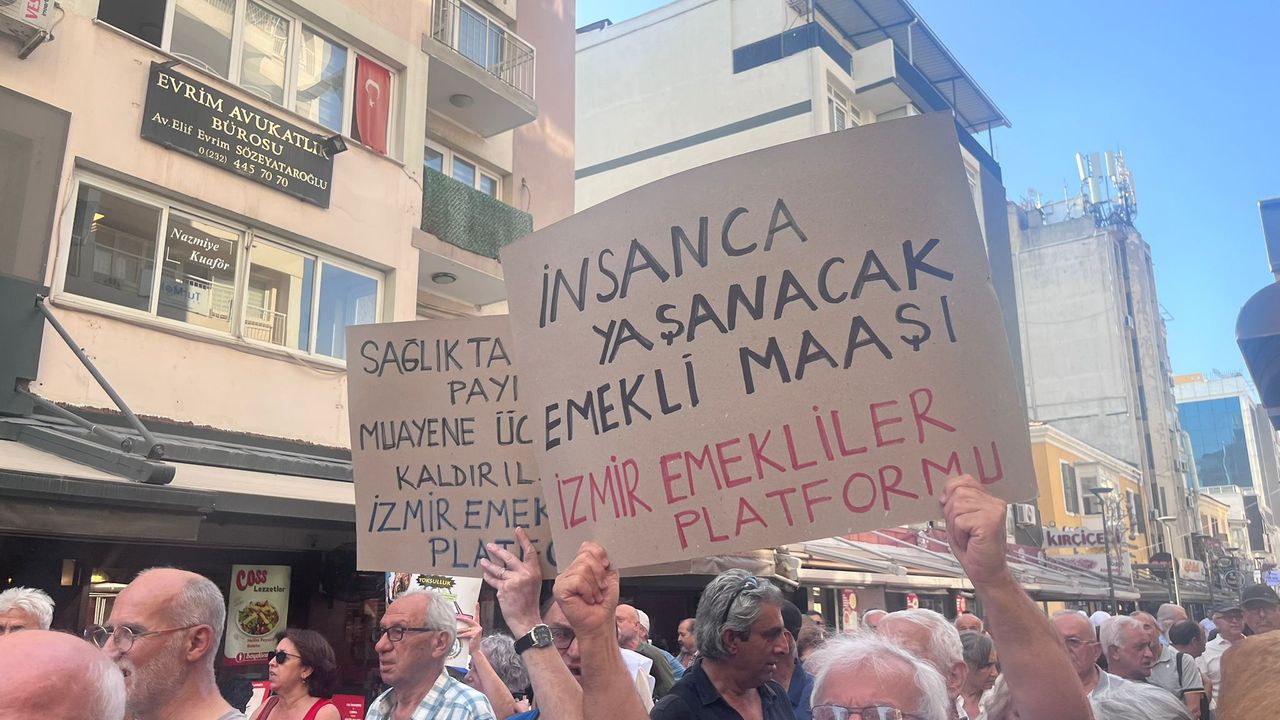 Son Mühür/Gamze Eskiköy- İzmir’de emekliler, ‘insanca yaşam’ taleplerini bir kez daha dile getirdi. İzmir Emekliler Platformu çatısı altında bir araya gelen Birleşik Emekliler Sendikası, Emekli ve Emekçiler Derneği, Emekli Meclisleri Sendikası, 2021 Tüm Emekliler Sendikası üyesi yurttaşlar, Alsancak’ta ÖSYM binası önünde toplandı.