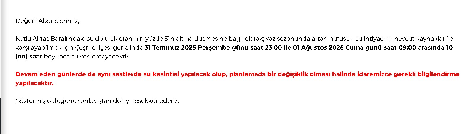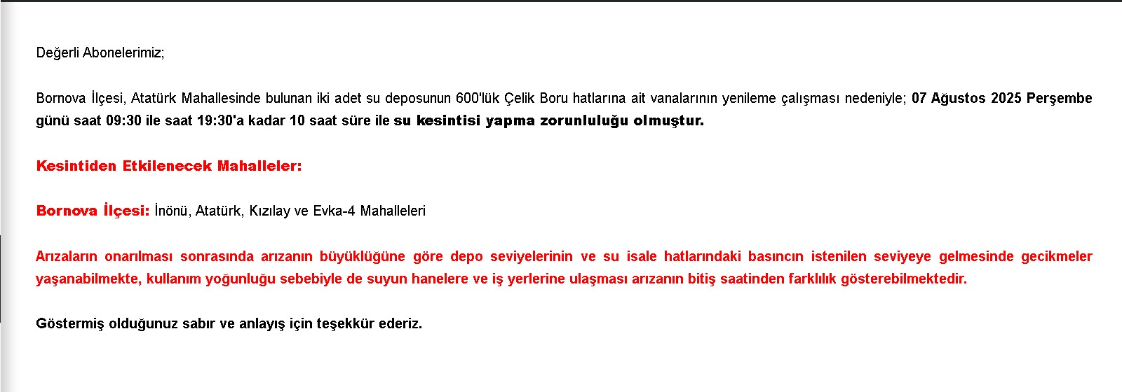Bornova Atatürk Mahallesi’nde bulunan iki adet su deposunun 600’lük çelik boru hatlarındaki vana yenileme çalışmaları nedeniyle 7 Ağustos 2025 Perşembe günü saat 09:30 ile 19:30 arasında 10 saat süreyle su kesintisi yapılacak.
