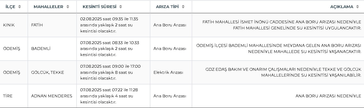 Tire Adnan Menderes Mahallesi’nde 7 Ağustos 2025 Perşembe günü saat 07:22 ile 11:28 arasında 4 saat sürecek su kesintisi yaşanacak. Ana boru arızası nedeniyle yapılan çalışmaların ardından su verilmeye başlanacak.