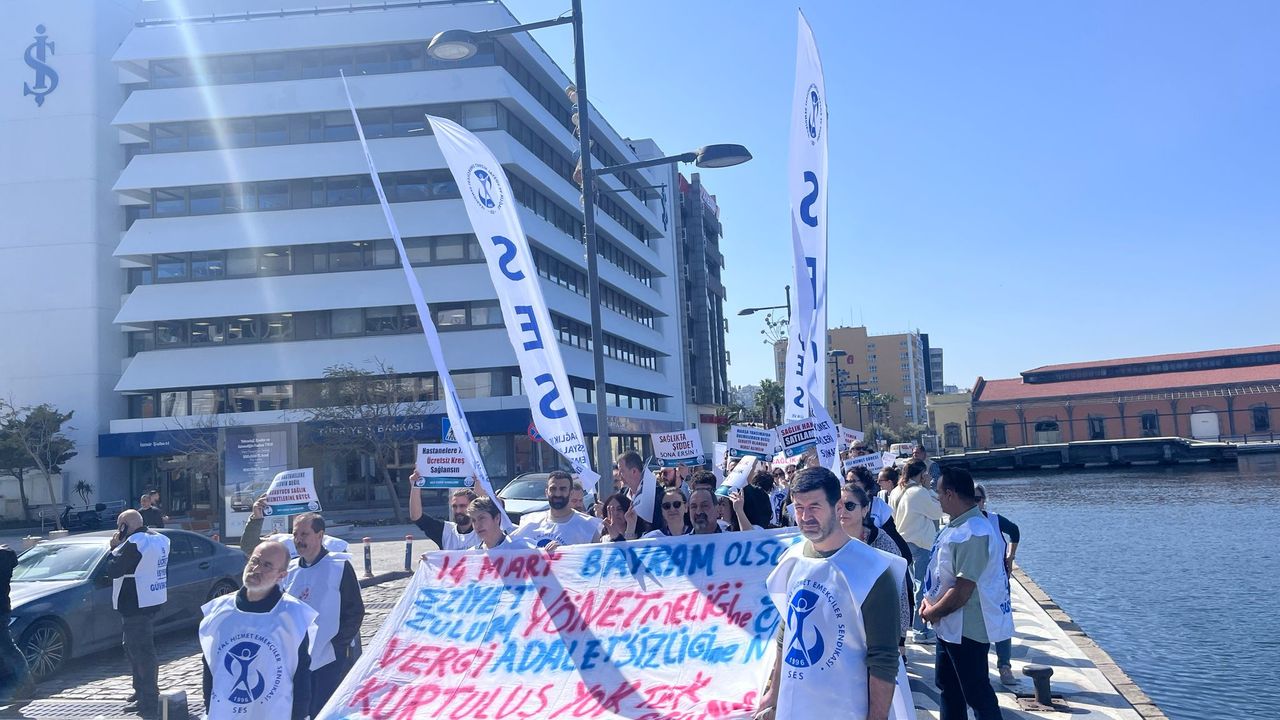 Son Mühür/Gamze Eskiköy- İzmir Sağlık Platformu, 14 Mart Tıp Bayramı’nda sağlık emekçilerinin taleplerini duyurmak için iş bıraktı. Grev nedeniyle hastanelere giden vatandaşlar sağlık hizmeti alamadan geri dönerken, sağlık çalışanları eski Sümerbank önünde toplanarak Cumhuriyet Meydanı’na yürüdü. “Bakanlık elini reçetemden çek, çetelere değil sağlığa bütçe” sloganlarıyla gerçekleşen protestoya, meydanda alkışlarla destek verildi. Eylem kapsamında Cumhuriyet Meydanı’na çelenk bırakıldı, ardından hayatını kaybeden sağlık çalışanları için bir dakikalık saygı duruşunda bulunularak basın açıklaması yapıldı.