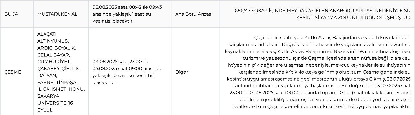Çeşme’nin Alaçatı, Altınyunus, Ardıç, Boyalık, Celal Bayar, Cumhuriyet, Çakabey, Çiftlik, Dalyan, Fahrettinpaşa, Ilıca, İsmet İnönü, Sakarya, Üniversite ve 16 Eylül mahallelerinde 04 Ağustos 2025 saat 23.00’te başlayacak olan kesinti, 05 Ağustos sabah 09.00’a kadar sürecek. Kesinti, iklim değişikliği ve azalan su kaynakları nedeniyle zorunlu olarak uygulanıyor.