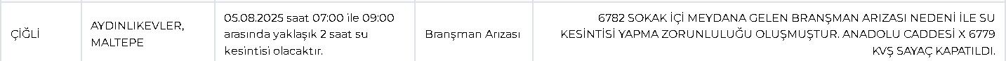 Son Mühür- İZSU tarafından yapılan duyuruya göre, Çiğli Aydınlıkevler ve Maltepe mahallelerinde, 05 Ağustos 2025 Salı günü saat 07.00-09.00 arasında yaklaşık 2 saat süreyle su verilemeyecek. Kesintinin nedeni 6782 Sokak içinde meydana gelen branşman arızası olarak bildirildi. Anadolu Caddesi x 6779 kavşağındaki sayaç kapatıldı.