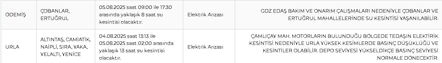 Ödemiş ilçesi Çobanlar ve Ertuğrul mahallelerinde, 05 Ağustos 2025 tarihinde saat 09.00 ile 17.30 arasında elektrik arızası kaynaklı su kesintisi yaşanacak. GDZ EDAŞ'ın bakım ve onarım çalışmaları nedeniyle bu bölgelerde su verilemeyeceği bildirildi.