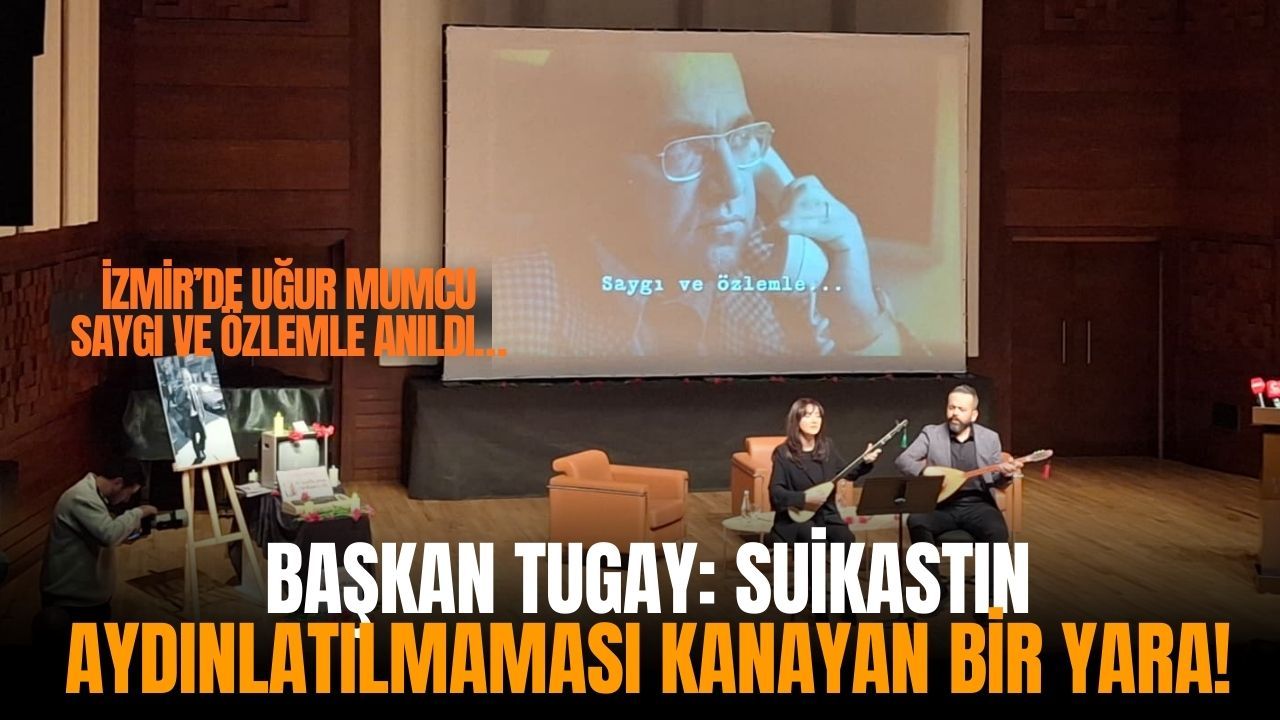 Törenin açılış konuşmasını yapan Büyükşehir Belediye Başkanı Tugay, “Tarihimiz ne kadar acılarla ve zorluklarla dolu olsa da bilmemiz gereken bir şey var. Belki de yaşadığımız tüm zorlukların nedeni bu gerçeğin altında yatıyor. Çok güzel bir coğrafyada yaşıyoruz. Zengin topraklarımız, denizimiz, akarsularımız var. Madenlerimiz var… Çalışkan, üretken ve zeki insanlarımız var. Bir asır önce bir ulusal mücadele kazandık, Mustafa Kemal Atatürk önderliğinde onurlu, bağımsız bir Cumhuriyet kurduk ama bu topraklar üzerindeki karanlık planlar hiç bitmedi, bitmeyecek. Evet, bunları hepimiz zaten biliyoruz ve sürekli söylüyoruz ve Uğur Mumcu da bunları söylüyordu ama bir farkla… O, söylediği her cümlenin altını belgelerle dolduruyordu. Yazılarıyla, kitaplarıyla siyaset, tarikat, mafya, terör örgütleri arasındaki tüm bağlantıları açığa çıkarıyordu. Karanlık köşelerde gizlenen halk düşmanlarını bir bir ifşa ediyordu…” dedi.