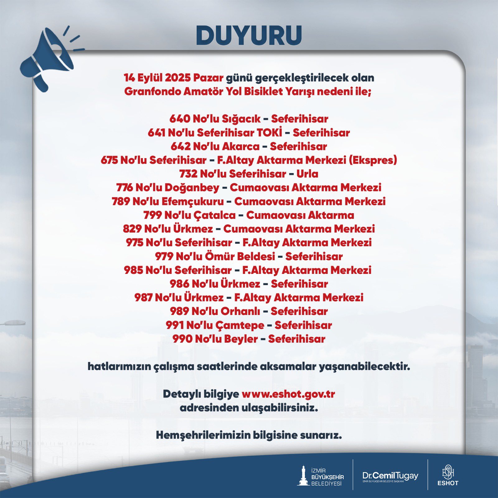 ESHOT yetkilileri, vatandaşların mağdur olmaması için yolculuklarını önceden planlamalarını ve mümkünse alternatif toplu taşıma araçlarını kullanmalarını tavsiye etti. Güncel güzergâh ve saat bilgileri ise www.eshot.gov.tr adresinden takip edilebilecek.