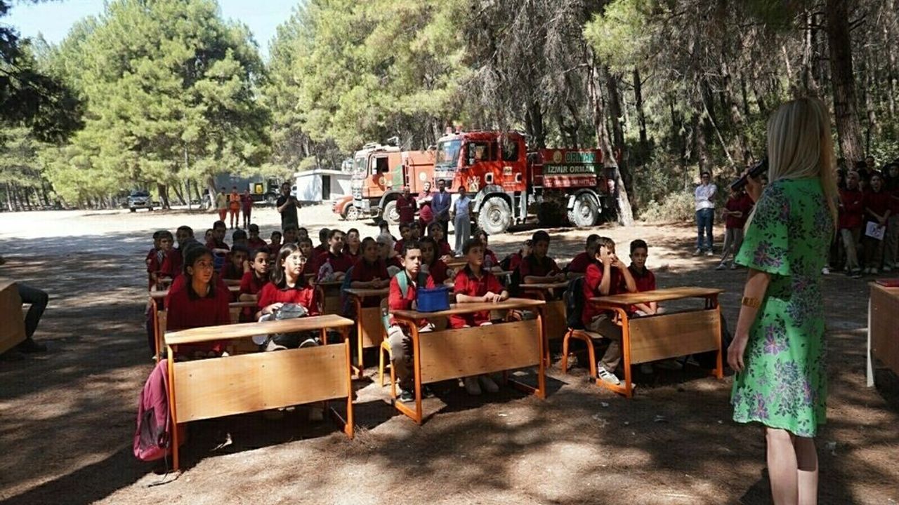 İzmir’in Gaziemir ilçesindeki İmam Hatip Ortaokulu öğrencileri, 2025-2026 eğitim-öğretim yılının ilk dersini sıradışı bir mekanda gerçekleştirdi. Sarnıç’taki orman alanında gerçekleştirilen etkinlikte, yanan ve yangından etkilenmeyen alanların birleşim noktasında oluşturulan geçici “derslikte” öğrenciler, doğayla iç içe eğitim alma fırsatı buldu. Okul Müdürü Özgür Şenyüz, öğrencilerin bu deneyimi uzun yıllar unutamayacağını belirtti.