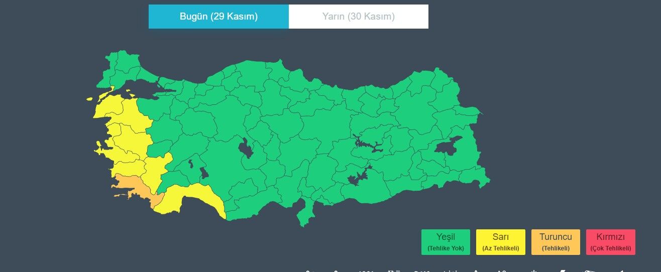Meteoroloji; Muğla için “turuncu”, İzmir, Antalya, Aydın, Balıkesir, Çanakkale, Denizli ve Manisa için “sarı” uyarı yayımladı. Bu bölgelerde yerel kuvvetli sağanak ve olası su baskınlarına karşı tedbirli olunması istendi.