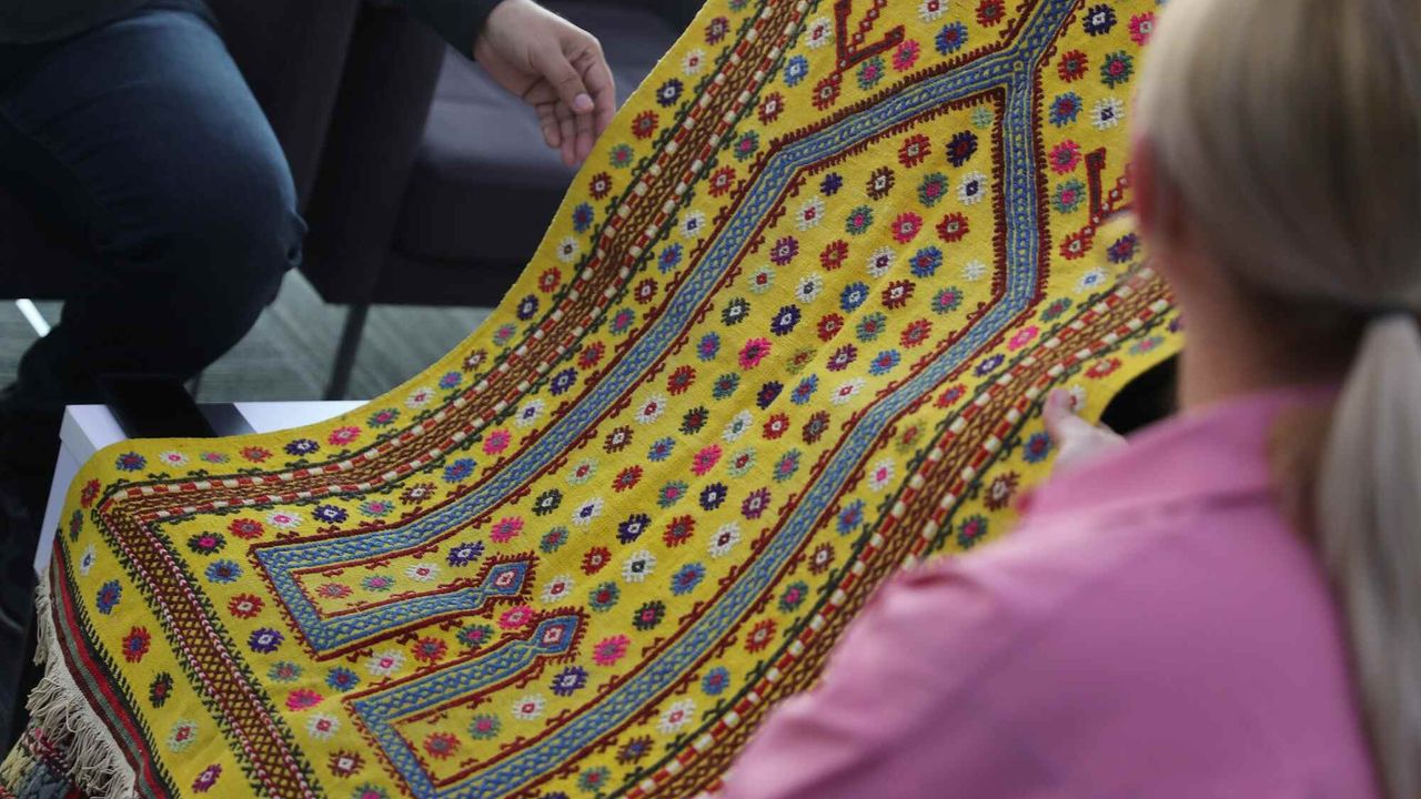 Doğadaki bitkilerden elde edilen kök boyalarla el yapımı olarak dokunan Helvacı kilimindeki motifler Türk kültürünün binlerce yıllık yolculuğuna dair derin anlamlar taşıyor” diye konuştu.,