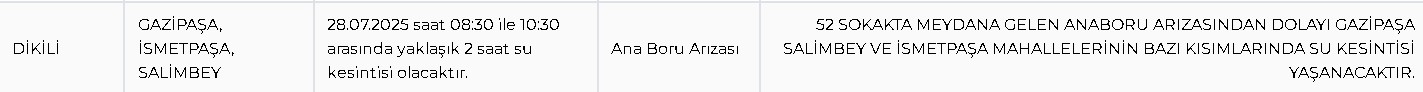 Son Mühür - İzmir’in Dikili ilçesine bağlı Gazipaşa, İsmetpaşa ve Salimbey mahallelerinde 28 Temmuz 2025 Pazartesi günü su kesintisi yaşanacak.