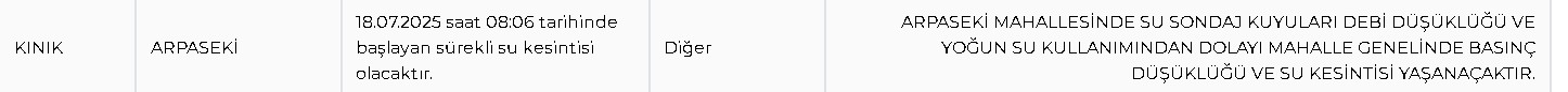 İzmir’in Kınık ilçesine bağlı Arpaseki Mahallesi’nde ise 18 Temmuz 2025 tarihinde saat 08.06 itibarıyla başlayan su kesintisi devam ediyor.