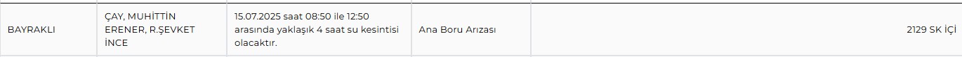 Bayraklı ilçesinin Çay, Muhittin Erener ve R. Şevket İnce mahallelerinde, 15 Temmuz 2025 saat 08.50 ile 12.50 arasında su kesintisi yaşanacak. Kesintinin nedeni ana boru arızası olarak açıklanırken, arıza 2129 Sokak içinde meydana geldi.
