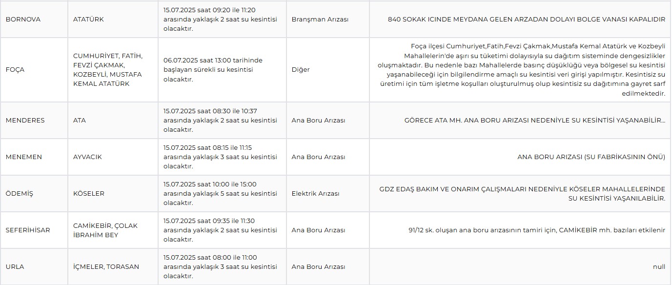 Foça ilçesinin Cumhuriyet, Fatih, Fevzi Çakmak, Kozbeyli ve Mustafa Kemal Atatürk mahallelerinde ise 06 Temmuz 2025 tarihinde saat 13.00'te başlayan sürekli su kesintisi devam ediyor. Aşırı tüketim ve bölgedeki dengesizlikler nedeniyle dağıtım sisteminde sorun yaşandığı, bu sebeple basınç düşüklüğü ve kesinti ihtimaline karşı bilgilendirme yapıldığı açıklandı.