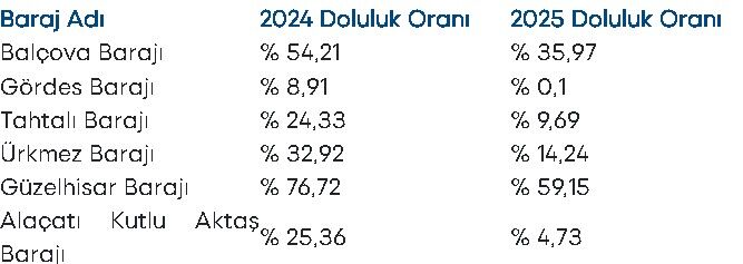 Temmuz 2025 verilerine göre, İzmir’in altı büyük barajındaki doluluk oranları geçen yıl ile kıyaslandığında şu şekilde gerçekleşti: