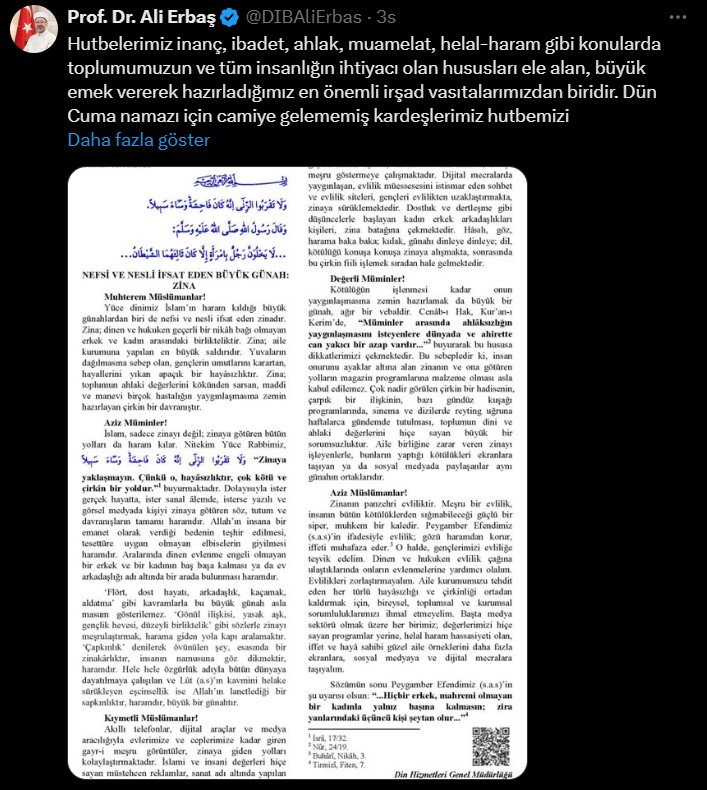 Tepkilerin ardından Diyanet İşleri Başkanı Ali Erbaş, sosyal medya platformu X üzerinden bir paylaşım yaptı. Erbaş açıklamasında, hutbelerin inanç, ibadet, ahlak ve helal-haram gibi temel konuları işlediğini belirtti. Erbaş, “Hutbelerimiz toplumun manevi ihtiyaçlarını karşılamaya yönelik olarak titizlikle hazırlanmaktadır. Cuma namazına katılamayanlar hutbemizi buradan okuyabilir” ifadelerini kullandı.