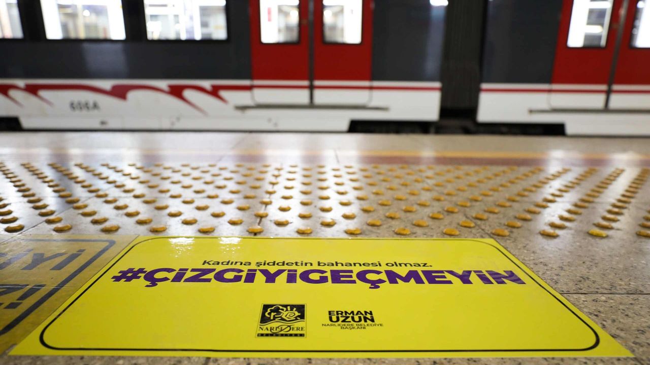 İzmir Metro A.Ş.’nin de desteğiyle hayata geçirilen projede, Narlıdere Kaymakamlık ile F. Altay durakları arasında, kadın hakları konusunda toplumsal bilinç oluşturacak #ÇİZGİYİGEÇMEYİN etiketleri asıldı.
